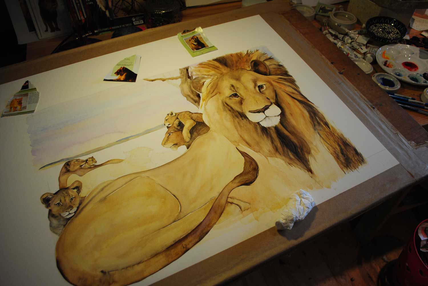 People often ask me how long it takes to do a painting. This one took about an hour or two drawing as well, and then there was the rough, which I did whilst watching A Knight's Tale with Heath Ledger and the lion came out looking rather like Heath Ledger, which was strange.